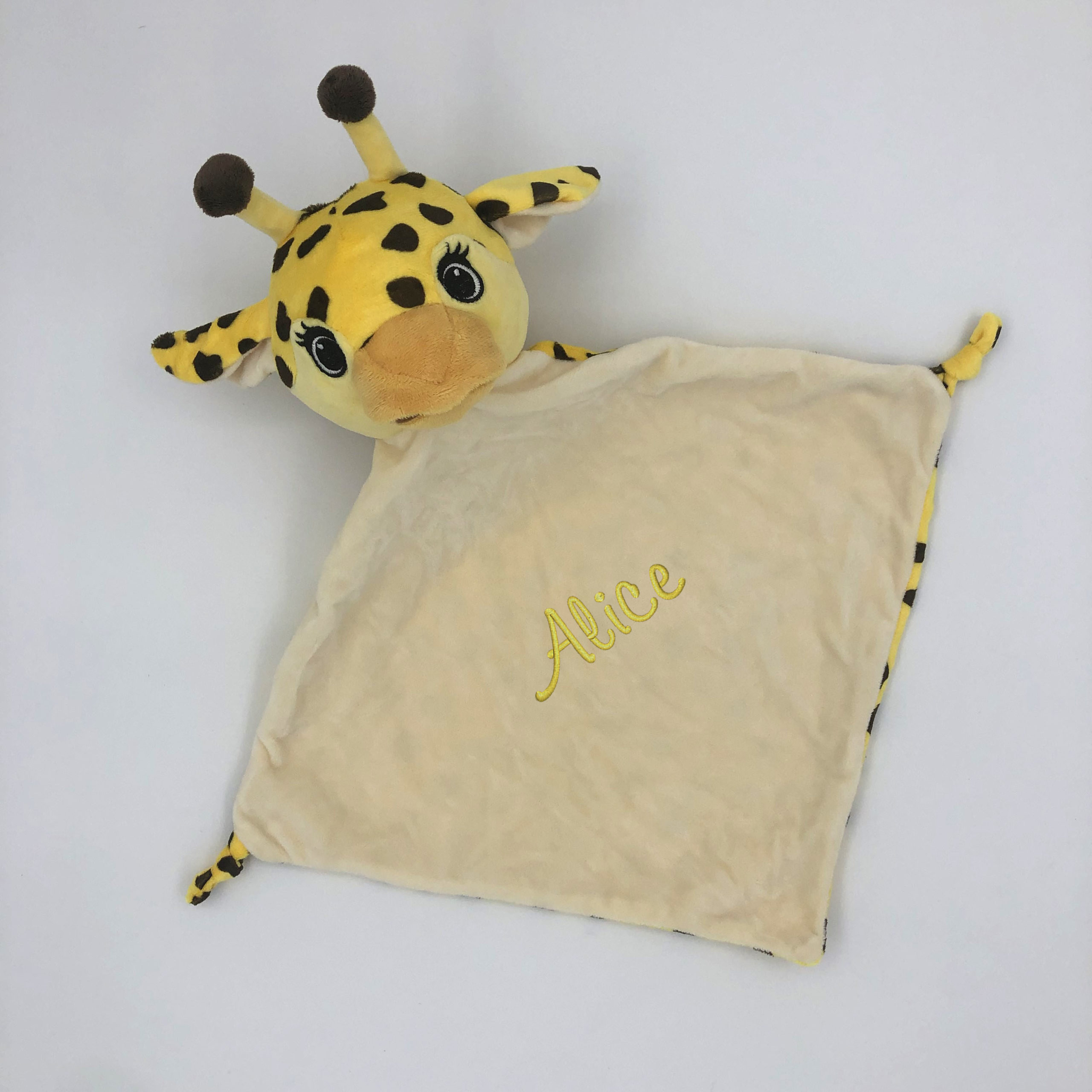 Chaque doudou est brodé au centre du carré, la broderie reste visible au verso.
